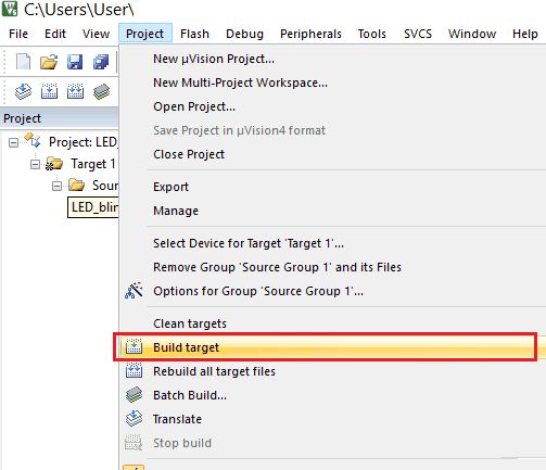 Now select the Project menu and click on “Build target”, it will build a project and give status in the Build output window with Error and Warning count if any.