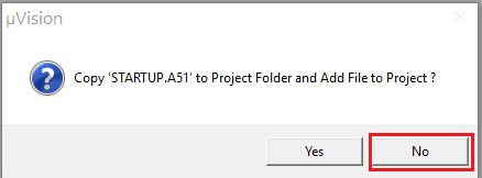 “µVision” window will ask for copy STARTUP.A51 to the project folder and add a file to the project (here is not necessary so we have selected No)