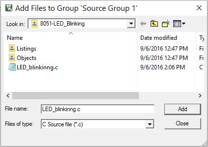 Select the program file saved with “.c “or “.asm” (in case of assembly language) and add it. Then close that window. You can see the added file in the “Source Group 1” folder in the left project window