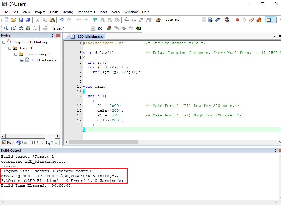 Now load the generated Hex file in one of any programmers available and flash it in your 8051 Microcontroller.