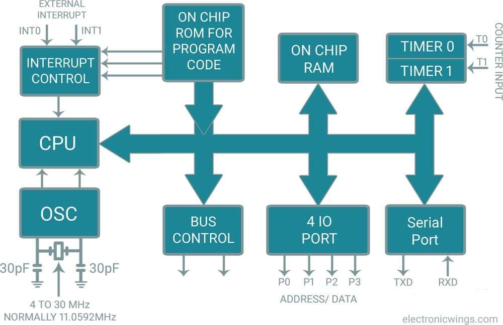All 8051 microcontrollers have unique architecture as shown in the figure, which consists of functional blocks to build 8051 powerful controlling machines.
