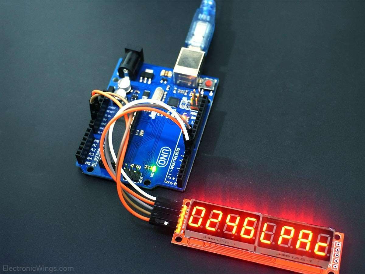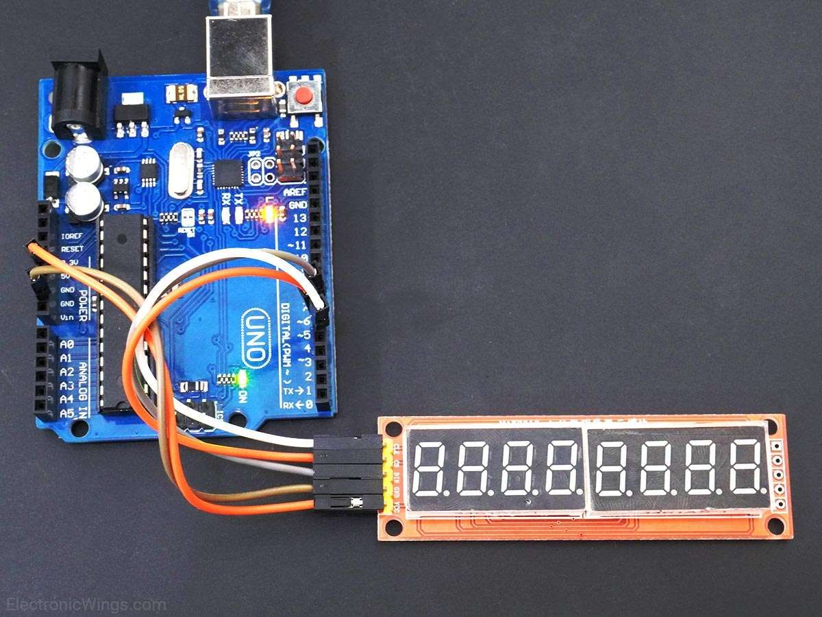 Using this library, it is possible to control up to eight SPI based 7-Segment modules (each module can have up to eight 7-segments displays) connected in cascade, using just 3 pins.