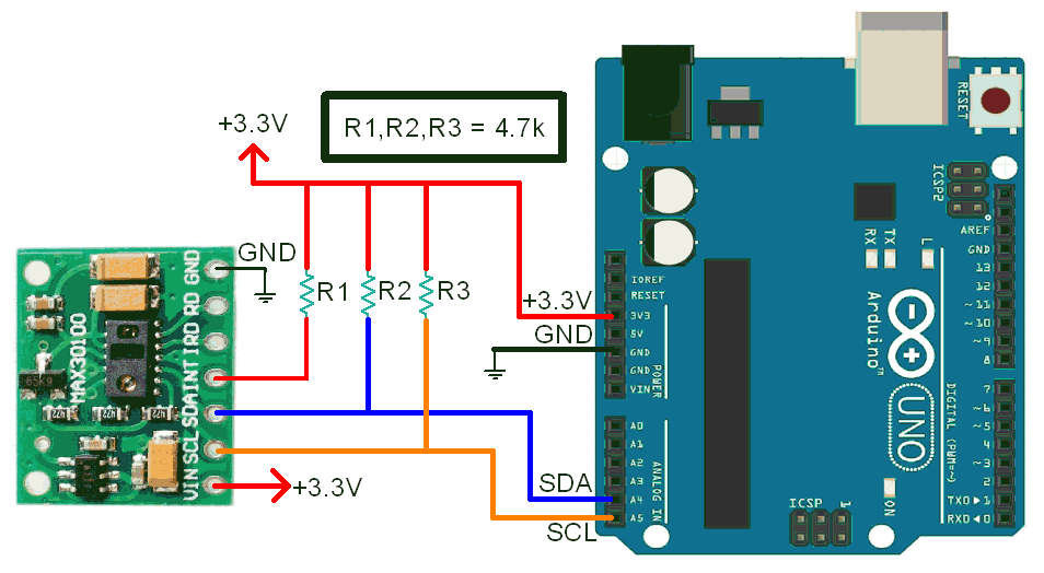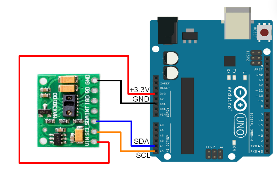 After removing the resistor connect the MAX30100 to the Arduino as shown in the below diagram.