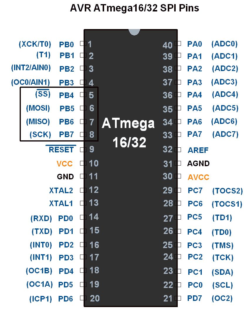 ATmega16 has an inbuilt SPI module. It can act as a master and slave SPI device. SPI communication pins in AVR ATmega are: