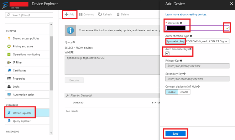 - Connect Device to IoT Hub : Click Enable.