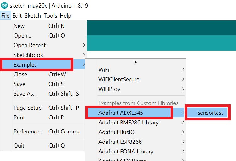 Now open an example of Adafruit ADXL345 io dashboard. To open it navigate to File ► Examples ► Adafruit ADXM345 ► sensortest