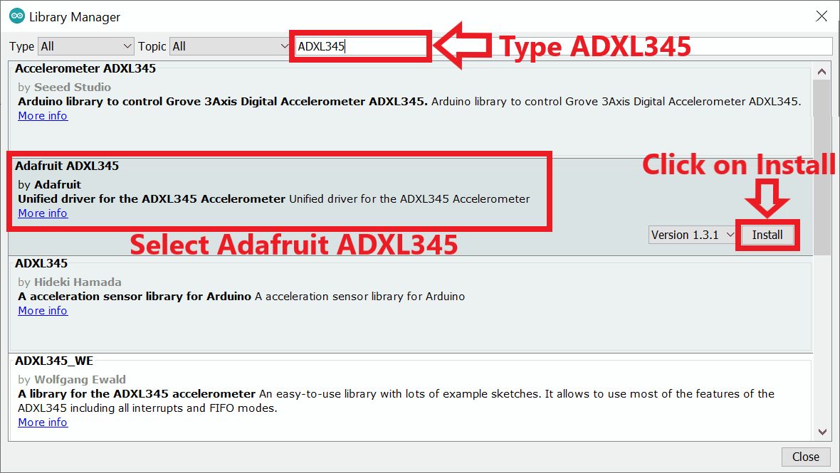 Here we are using Adafruit libraries for the above example. We will need to install the Adafruit ADXL345 library using the Arduino Library Manager.