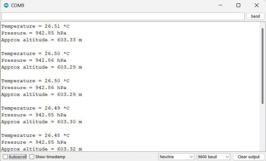 Reading the values from BMP280 and displaying them on the Arduino IDE’s serial monitor.
