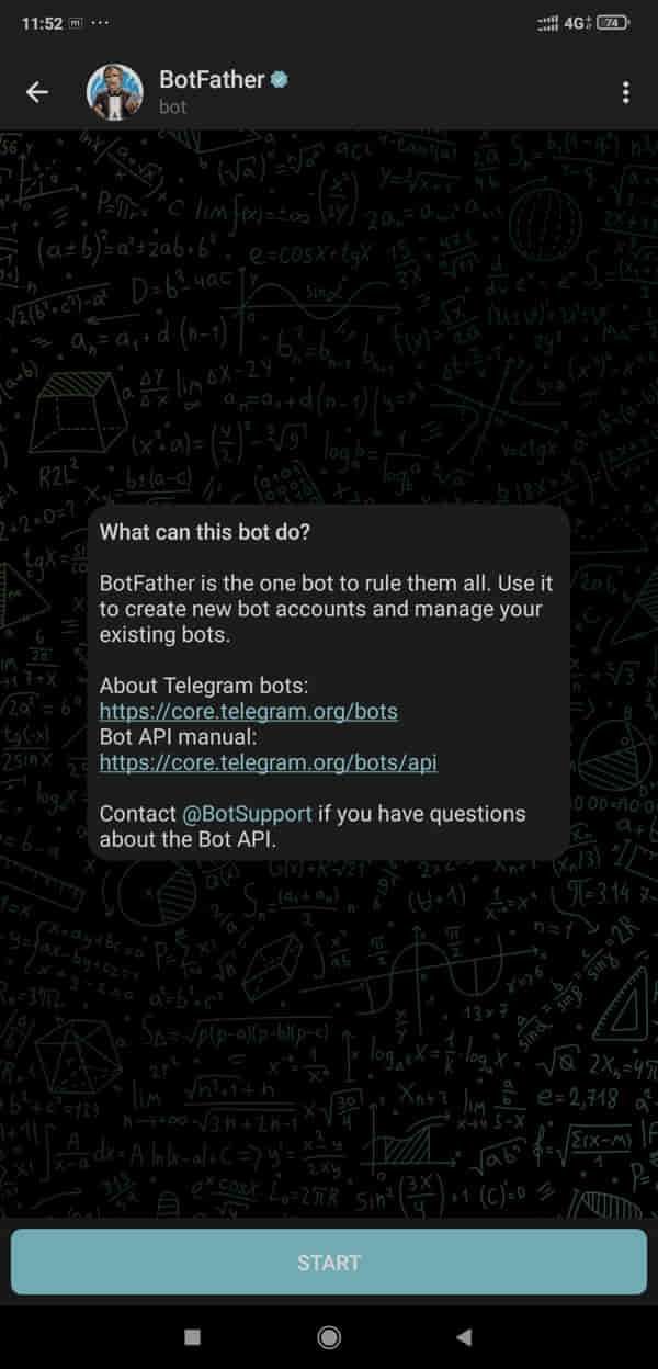 Noe find the Botfather in the result and open it and click ok start.