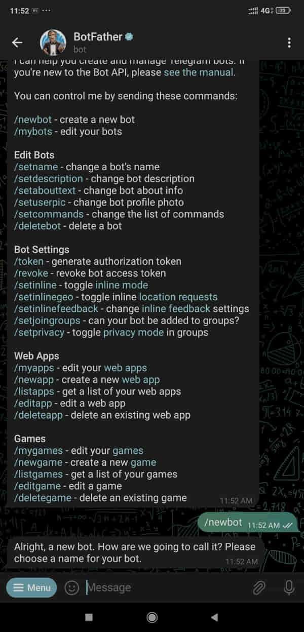 Now type /newbot and press enter.