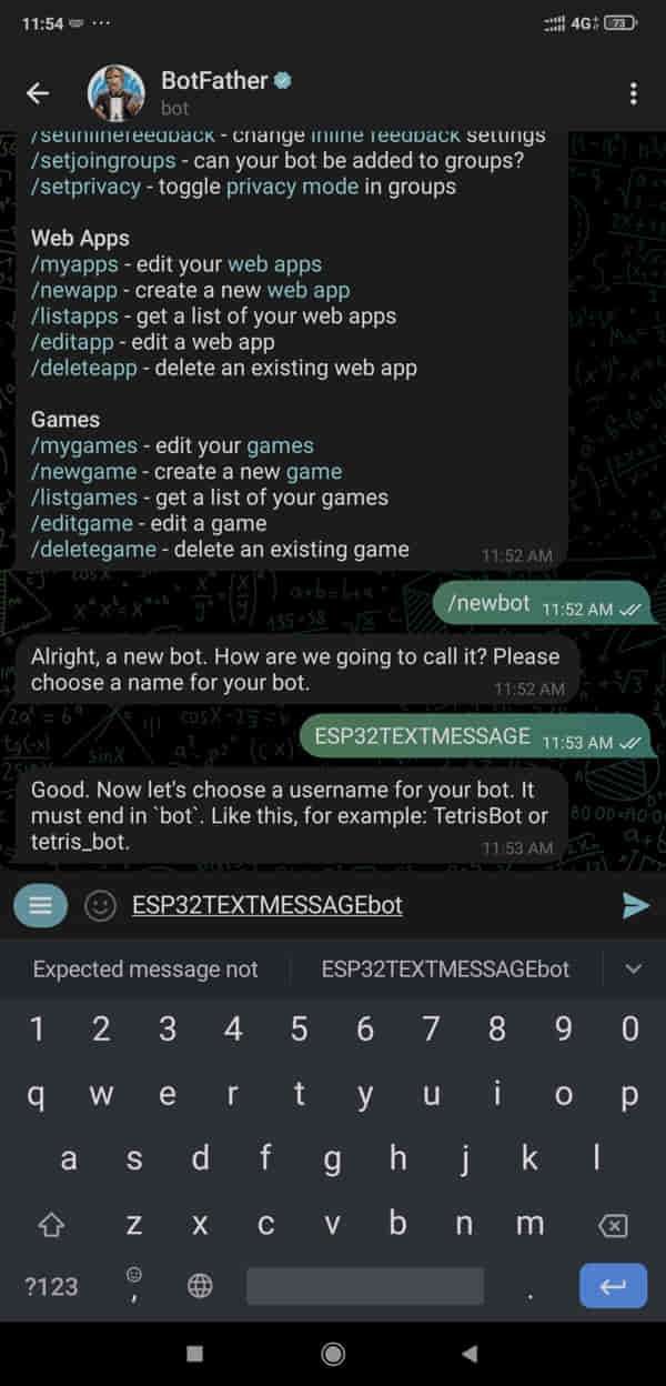 String from_name = bot.messages[i].from_name;When the receiver receives the /start message the ESP32 will send the command guidance to the user (telegram).
