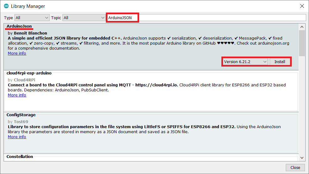 Now install another library which is Arduinojson library for the above example. We need to install the Arduinojson library using the Arduino Library Manager.