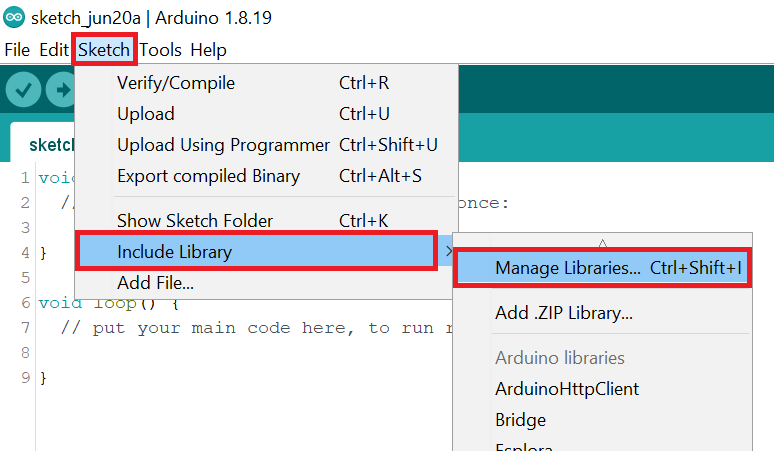 - Navigate to Sketch ► Include Library ► Manage Libraries…