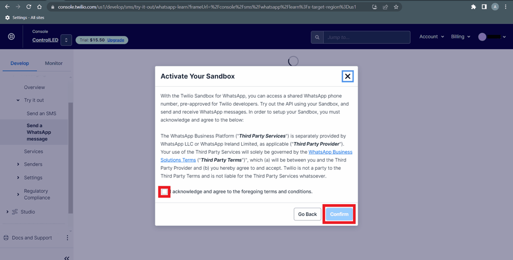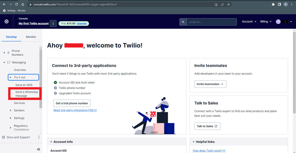 Now go to left side menu and click on Messaging-> Try it out -> Send a WhatsApp message.