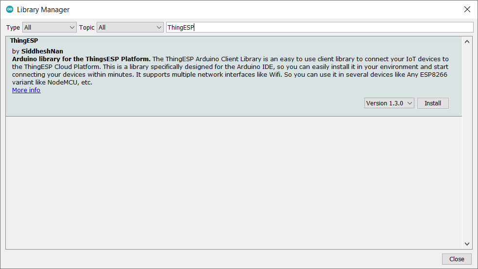 - The library Manager window will pop up. Now enter ThingESP into the search box, and click Install on the ThingESP option to install version 1.3.0 or higher. As shown below image.