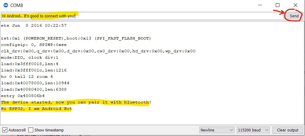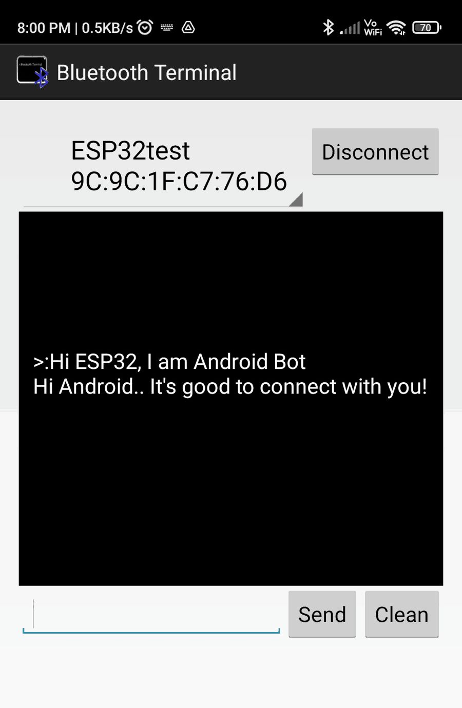 - After connecting with the ESP32test, we can type the string and send it to ESP32. Also, we can send a string to our Smartphone via ESP32 Bluetooth.