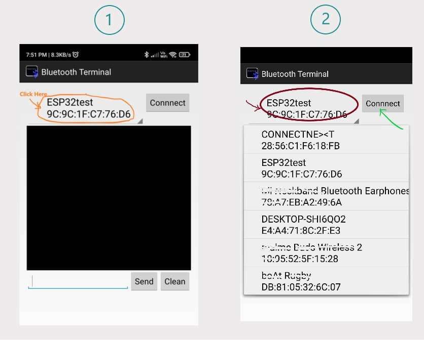 - After successfully paring, Open the “Bluetooth Terminal” Application, and connect to the “ESP32test”. Screenshot as follow: