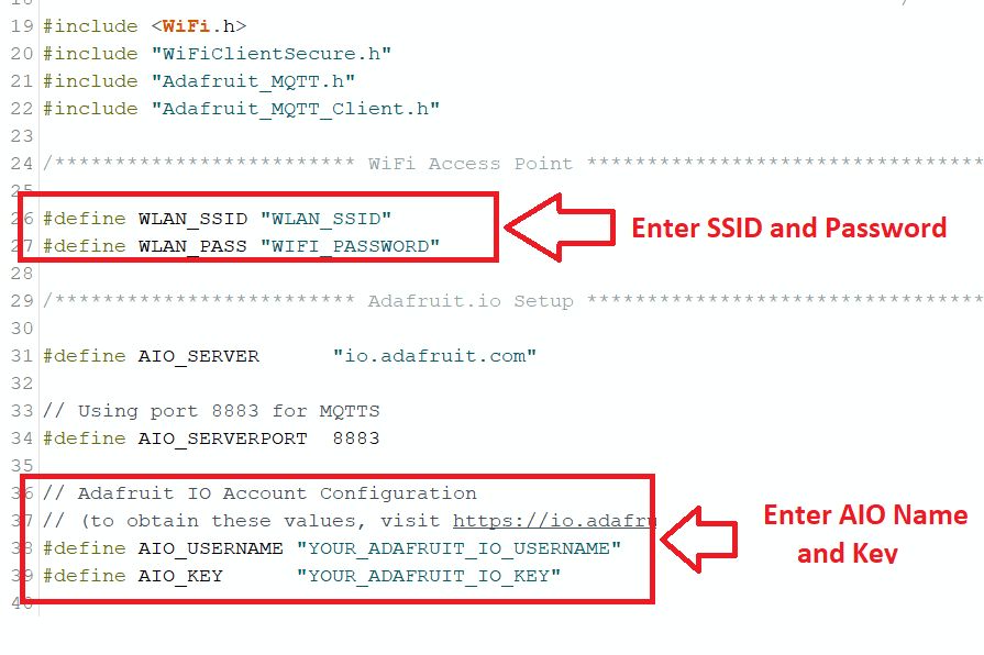 Now edit the Wi-Fi and Adafruit io credentials with correct information of example as shown in below image.