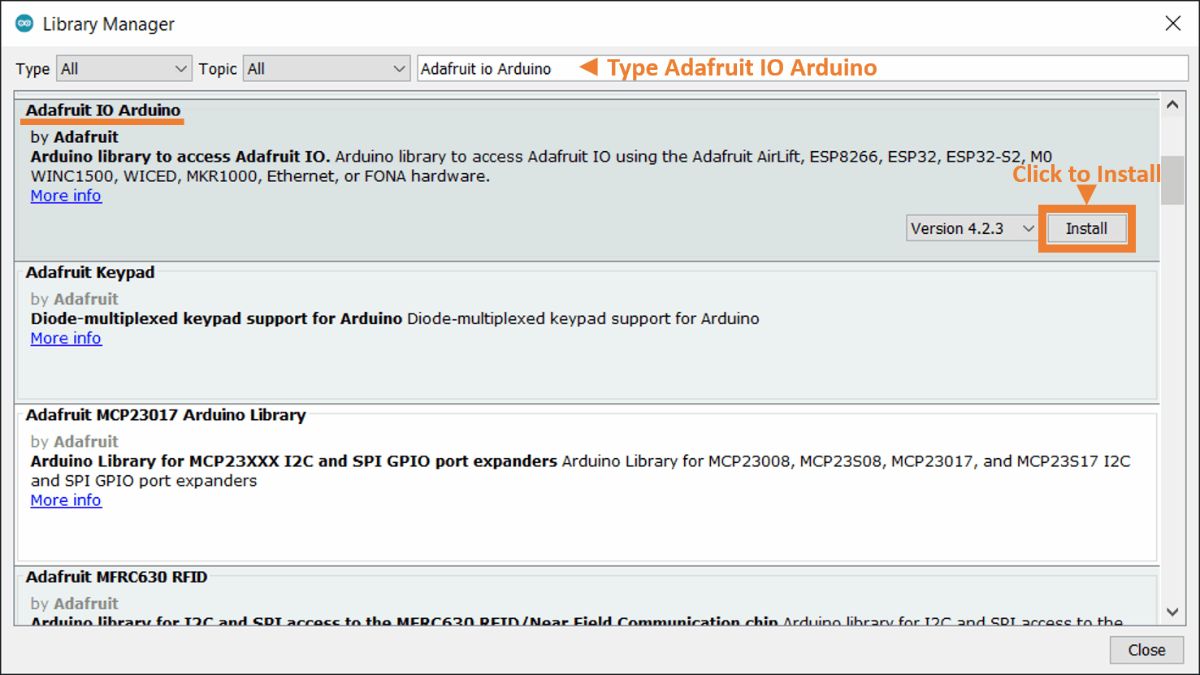 The library Manager window will pop up. Now enter Adafruit IO Arduino into the search box, and click Install on the Adafruit IO Arduino library option to install version 4.2.0 or higher.