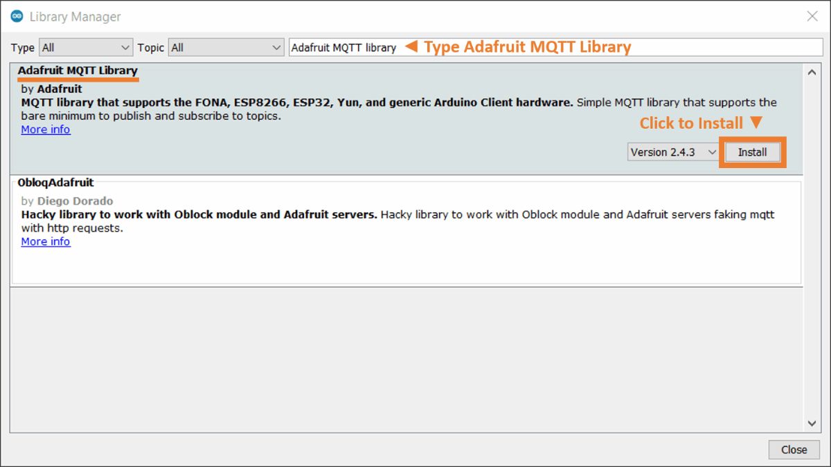 Now enter Adafruit MQTT into the search box, and click Install on the Adafruit MQTT library option to install version 2.4.2 or higher.
