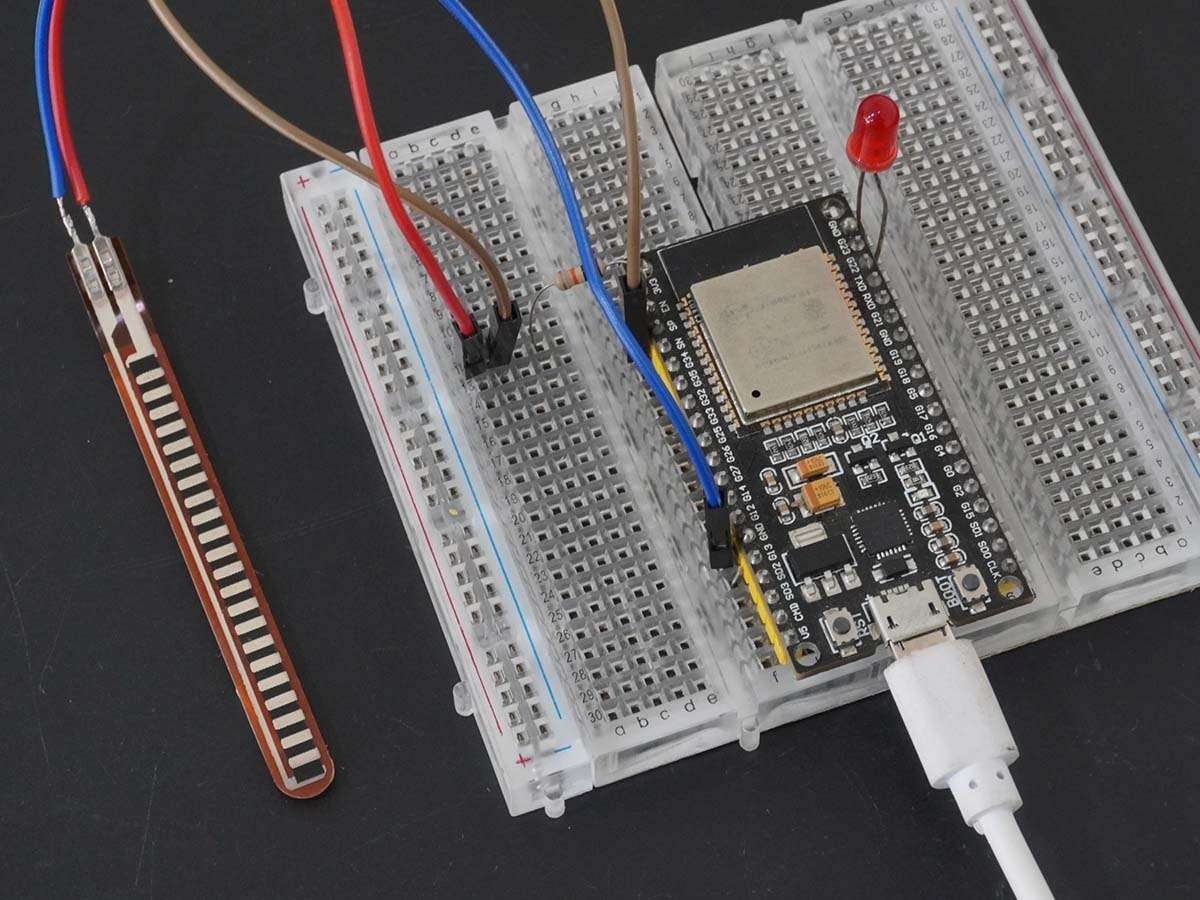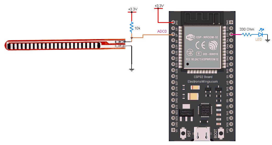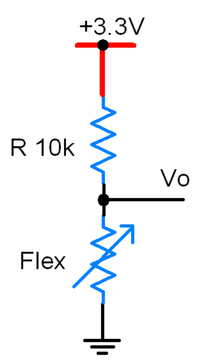 For example, the esp32 works on 3.3V so with 3.3V supply and a 10K resistor connected in series with a flex sensor.