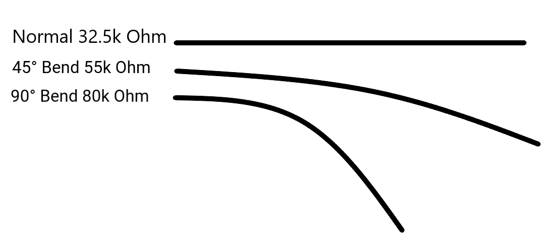 The conductive ink on the sensor acts as a resistive element. In its straight position, the sensor exhibits a resistance of approximately 32.5k ohms.