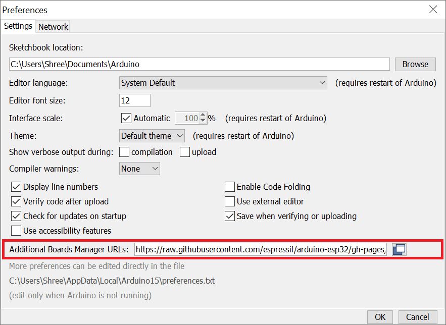 Now on the Preference window, Enter the below link in Additional Boards Manager URLs