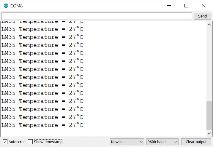 Let’s take a simple example to interface the LM35 temperature sensor and monitor the room temperature and display it on the serial window.