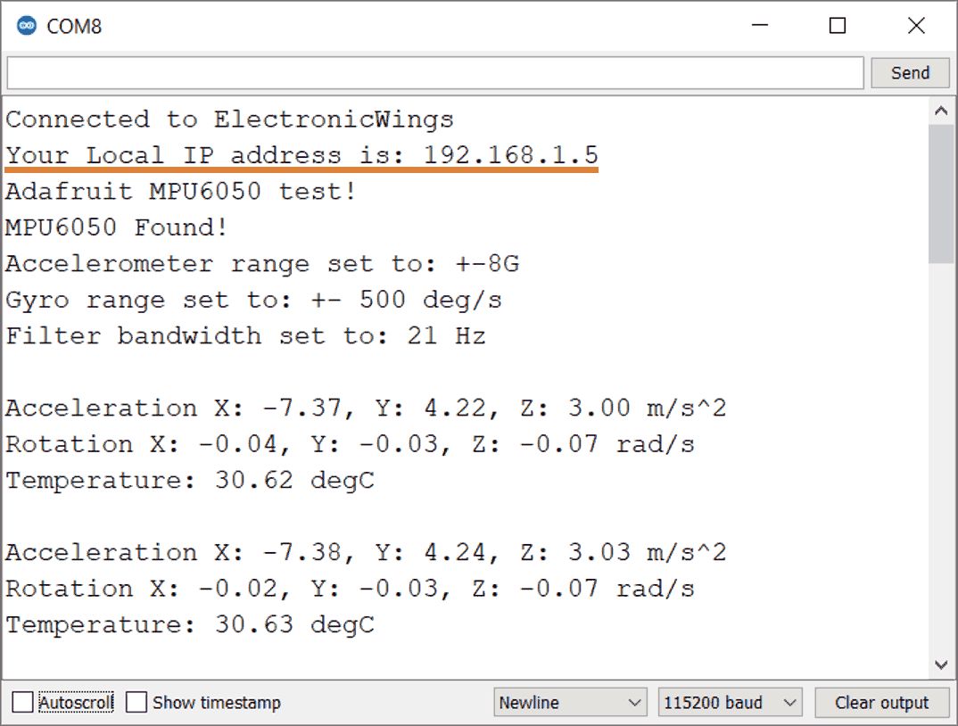 - If all are ok, then the web page will start showing current acceleration, gyro readings, and temperature on the web server like in the below image.