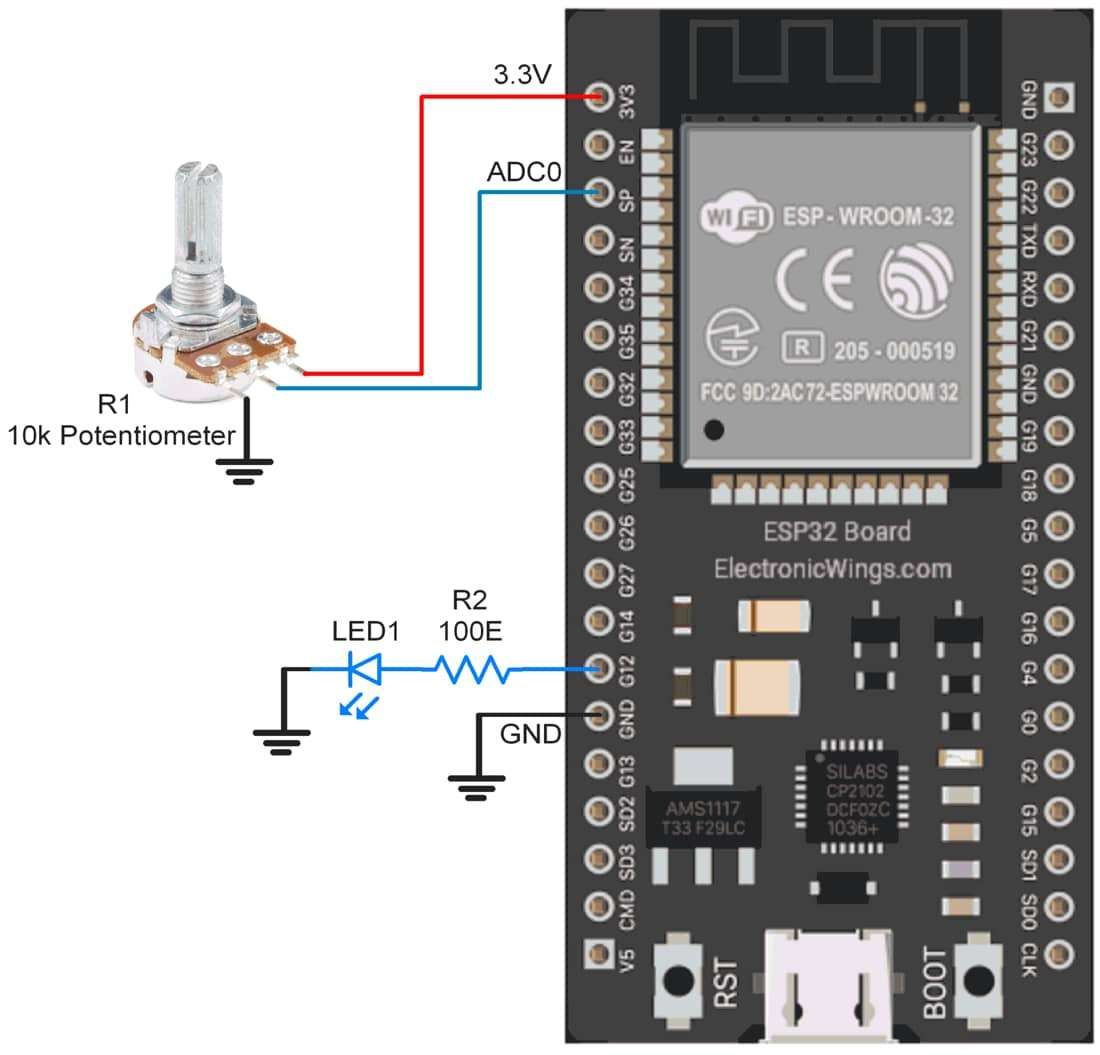 Let’s build an application in which we will control the brightness of LED using ESP32 by varying the potentiometer knob. So, when we rotate the knob of the potentiometer, the ADC of ESP32 will read this analog signal. Then we will generate PWM signal proportional to the analog signal.