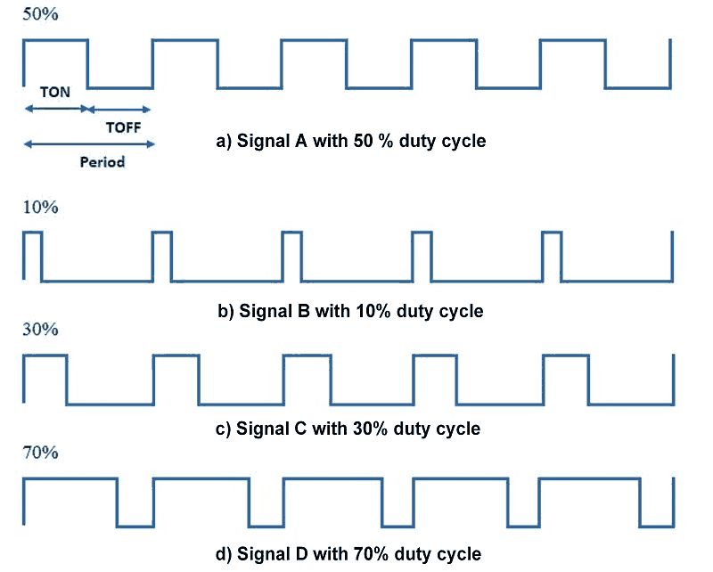 A period of a pulse consists of an ON cycle (3.3V) and an OFF cycle (0V). The fraction for which the signal is ON over a period is known as a duty cycle.
