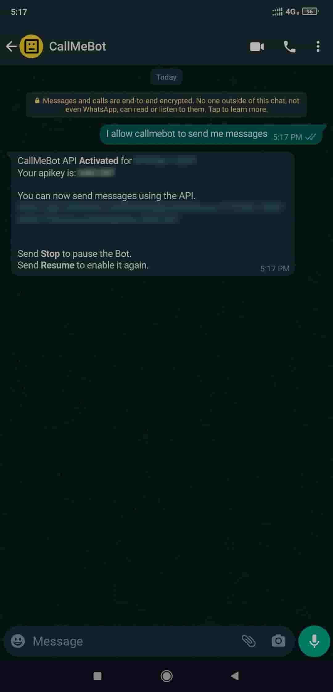 - Wait until you receive the message "API Activated for your phone number. Your APIKEY is 123123" from the bot.