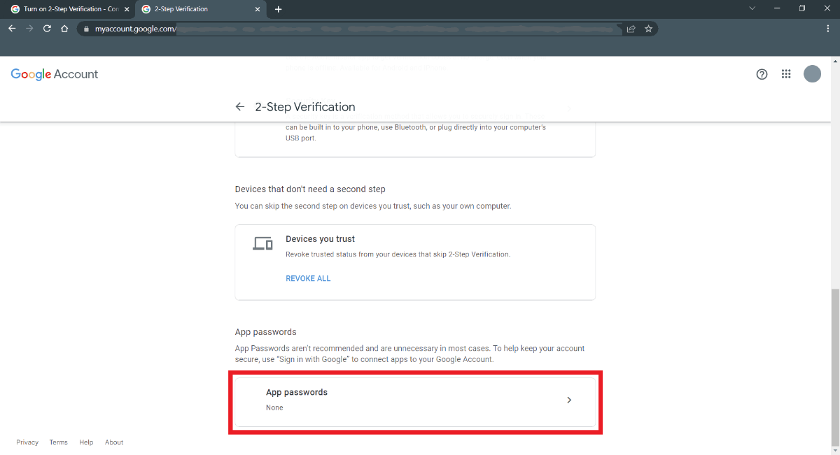 - now inside the Two-step verification just scroll down and click on App passwords