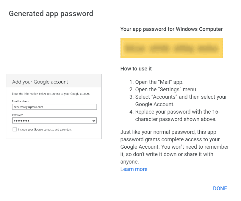 The App Password is a unique 16-digit code that gives permission to a less secure app or device to access your Google Account.