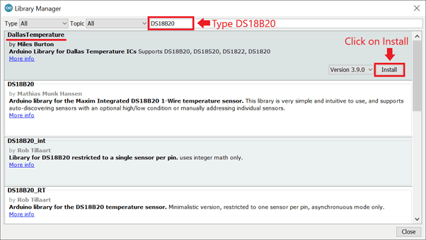 - The library Manager window will pop up. Now enter DS18B20 into the search box, and click Install on the DallasTemperature option to install version 3.9.0 or higher. As shown below image.