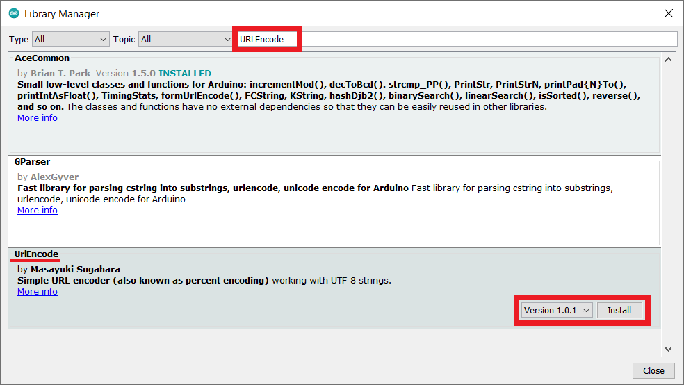 - The library Manager window will pop up. Now enter URLEncode into the search box, and click Install on the URLEncode option to install version 1.0.1 or higher. As shown below image.