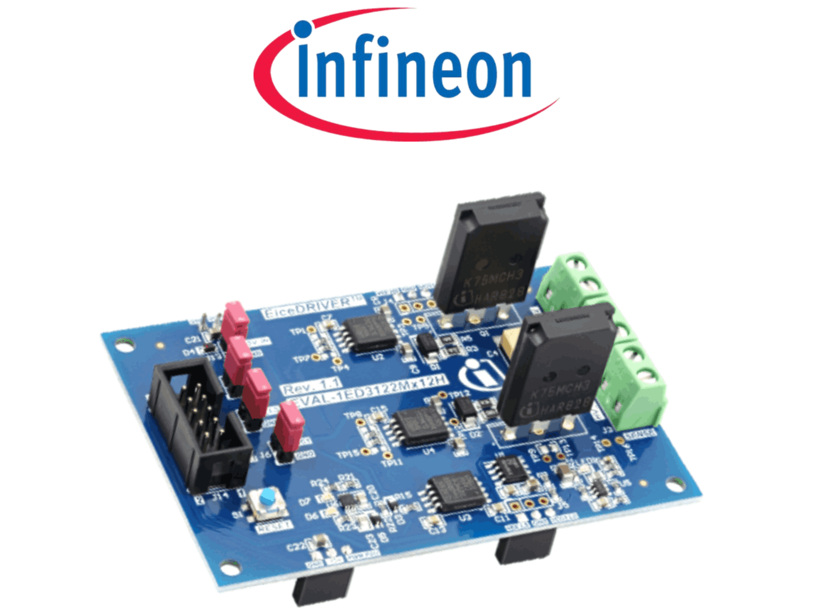 EVAL-1ED3122MX12H is an evaluation board from Infineon Technologies designed for the 1ED3122MX12H, a 2300V, 10A, 5.7kV (rms) single-channel isolated gate driver with an active Miller clamp. The EVAL-1ED3122MX12H is configured in a half-bridge setup with two gate driver ICs (1ED3122MU12H) to drive power switches like IGBTs and SiC MOSFETs. This board is equipped with TRENCHSTOP™ IGBT IKQ75N120CH3. An additional gate driver IC is utilized for isolated over-current feedback signals from the high voltage side to the logic control side. A fast operational amplifier functions as a comparator for over-current detection. This board is best suited for double-pulse testing. Furthermore, 1ED3122MU12H belongs to the EiceDRIVER™ Compact 1ED31xx family (X3 compact family). The 1ED3122 offers active Miller clamp, accurate and stable timing, active shutdown to ensure a safe IGBT off-state if the output chip is not connected to the power and short-circuit clamping to limit the gate voltage during a short circuit.