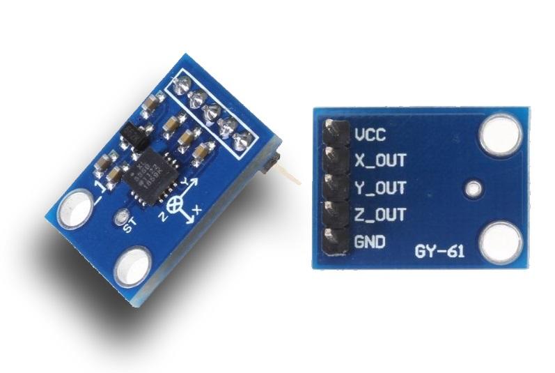 ADXL335 is a 3-axis accelerometer that provides analog output for acceleration along the x, y, and z-axis.