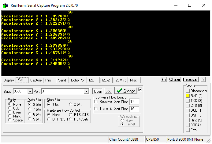 Here we can see ADXL335 analog raw value on serial port getting from X, Y, Z pin serially.