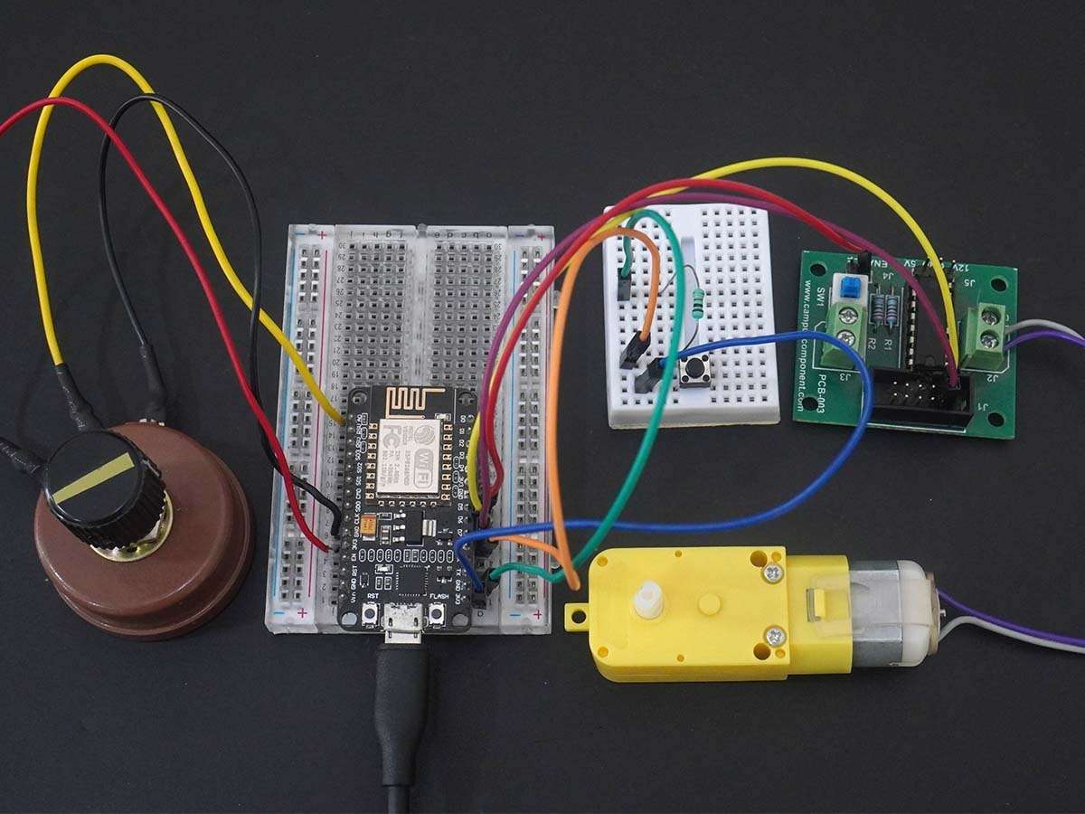 Here, the potentiometer is used as a means for speed control, and input from the tactile switch is used to change the direction of the motor.