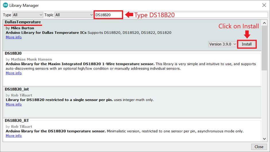 - The library Manager window will pop up. Now enter DS18B20 into the search box, and click Install on the DallasTemperature option to install version 3.9.0 or higher. As shown below image.