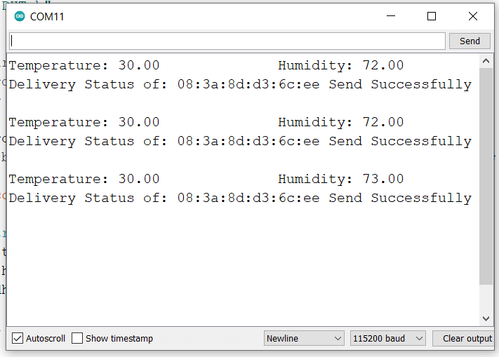 DHT11_data.hum = dht.getHumidity(); /*Get the Humidity value*/Here we’ll send the temperature and humidity every three seconds.