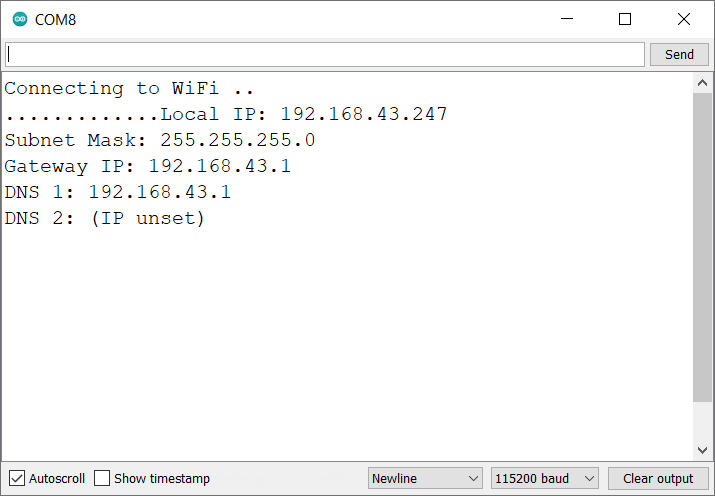 IPAddress dns(192, 168, 1, 1);We need to use the function WiFi.config() to set all parameters. This function returns Boolean value indicating configuration is successful or not!