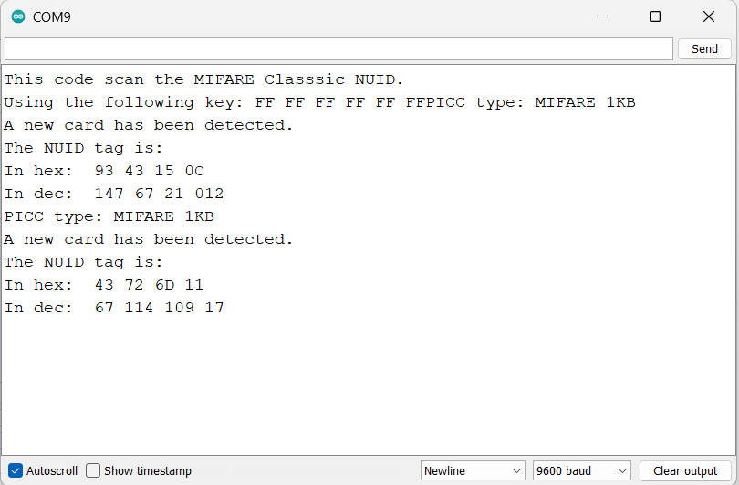 * will show the type, and the NUID if a new card has been detected. Note: you may see "Timeout in communication" messages