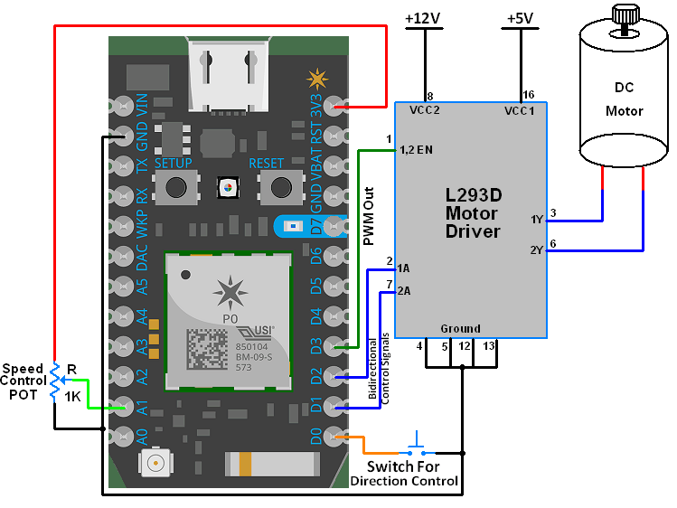 Here, potentiometer is used as a means for speed control and an input from tactile switch is used to change the direction of motor.