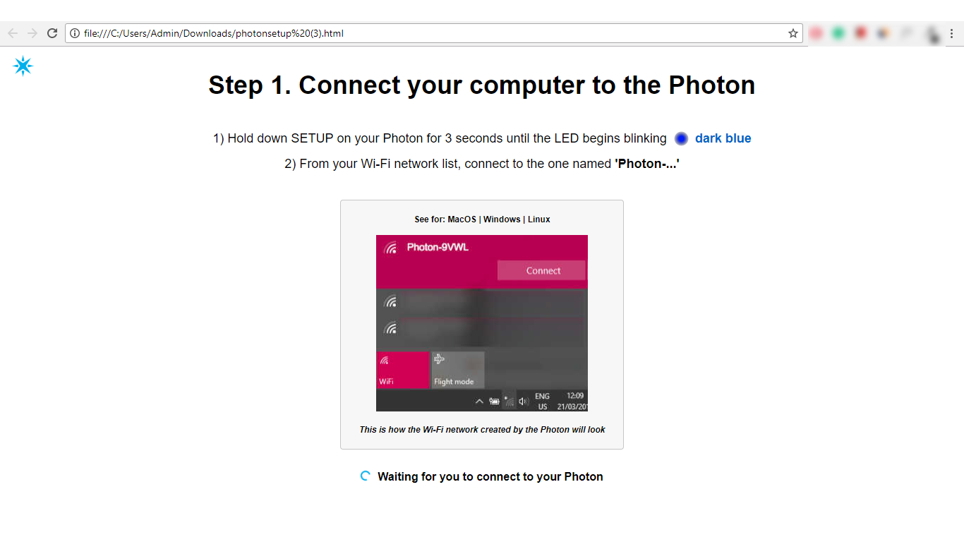 - Open the file (photonsetup.html) and Connect your PC to the Photon, by connecting to the network named PHOTON-...