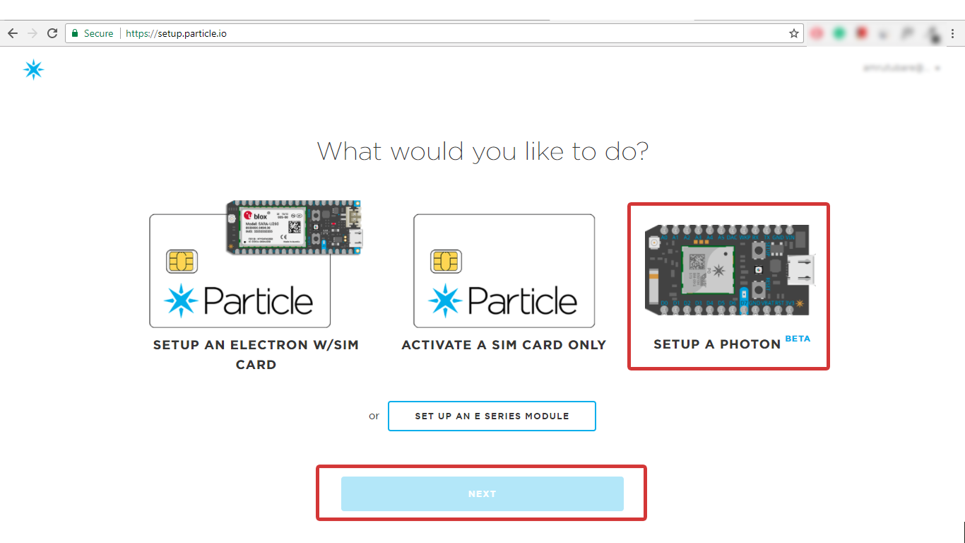 - Then, select Setup a Photon option for Particle Photon Board and then click on NEXT as shown below,