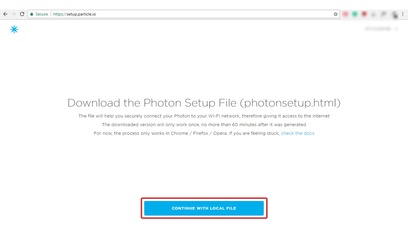 - Click on Continue with Local File as shown in above image which will download photonsetup.html file