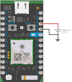 To use internal RTC module of Particle Photon, we need to connect CMOS battery (here 3 V) to its VBAT pin. When 3V3 is not present or power gets turned off, the supply voltage which is connected to VBAT will provide power to RTC and update time and date continuously. Here we used 3 Volt CMOS battery cell.