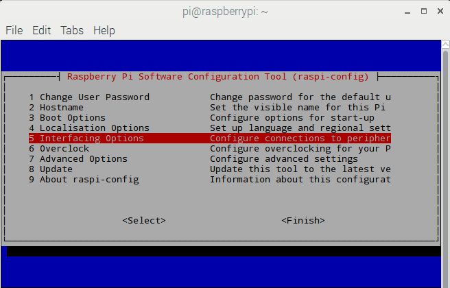 sudo raspi-configSelect -> Interfacing Options